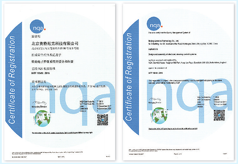 公司一直致力于打造高品质的电动助力转向控制器产品,建有严密的生产质量管理流程和工艺流程,通过注重生产细节,不断生产出客户满意的产品。2005年通过中国汽车工程研究院质量监督检验中心性能测试,2006年通过国家轿车质量监督检验中心EMC测试,2010年通过TS16949质量管理体系认证。